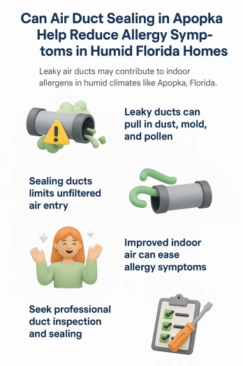 From years of working in Central Florida homes, one pattern is clear: duct sealing is one of the most overlooked solutions for reducing allergy symptoms in humid climates like Apopka.
